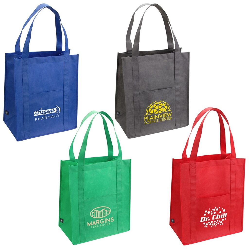 This Reusable Shopping Bag is made of premium eco-friendly 100GSM non-woven material and recycled P.E.T from 100% post-consumer water bottles. It has an 8” gusset and an exterior pocket, making it great for carrying groceries and practically any other item. This could be a tremendous move-in gift for residents as well!