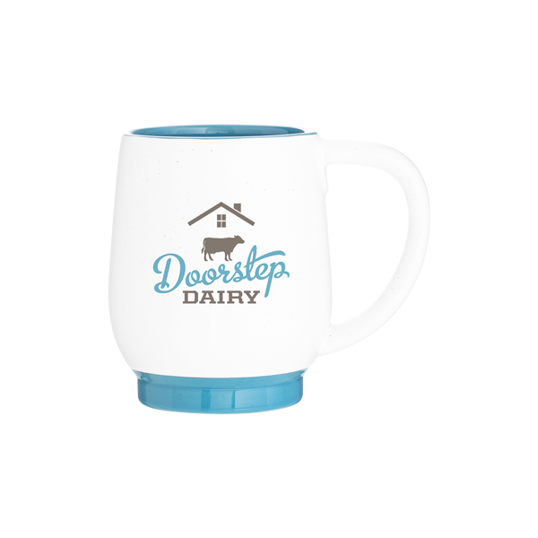 The Lark mug is a new 12oz stoneware mug, featuring a tapered design and tiered base for stacking. Each mug is white with a campfire-style speckle and trimmed in one of 6 colors.