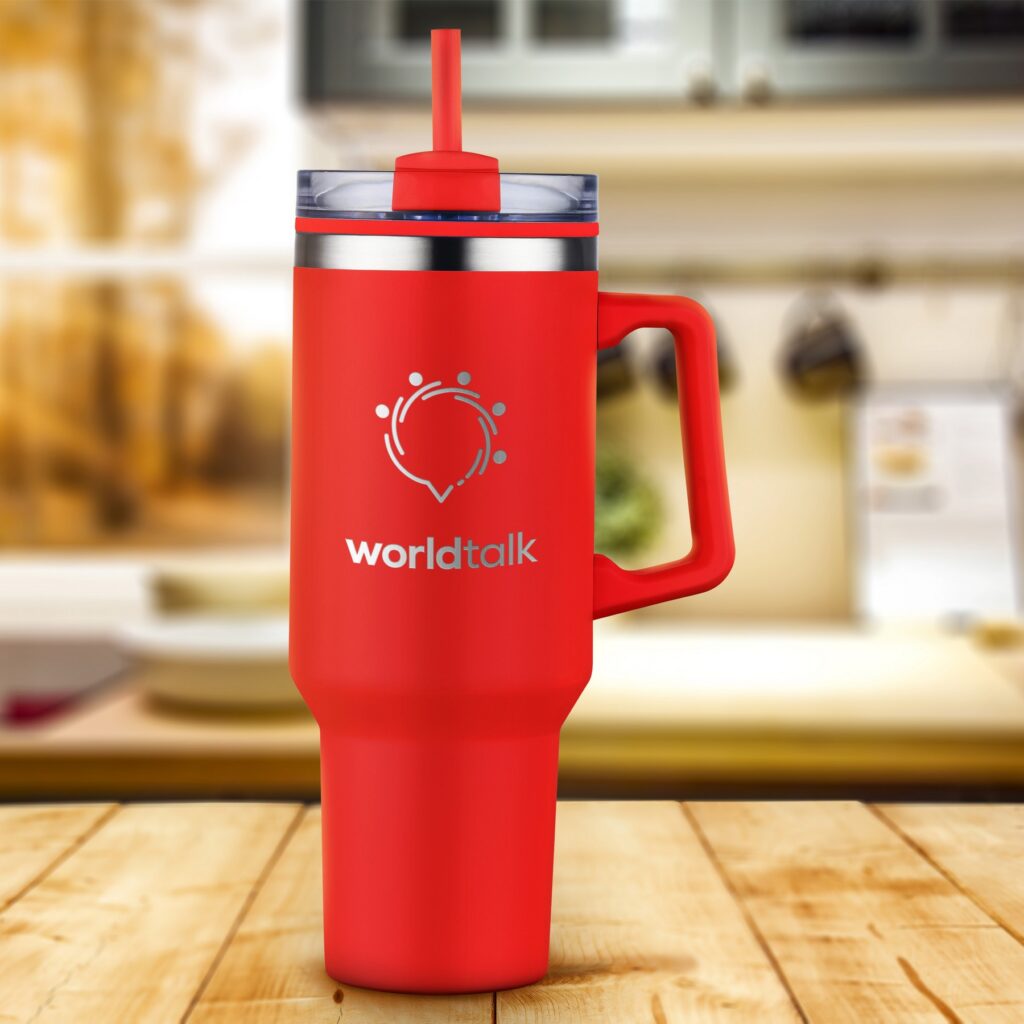 Keep your employees hydrated all summer with this 40 oz. Double Wall Tumbler. This drinkware is made of stainless steel and has double-walled vacuum insulation that will keep your drinks cold for up to 30 hours. Its splash-proof straw opening and handle make it easy to sip on the go.
